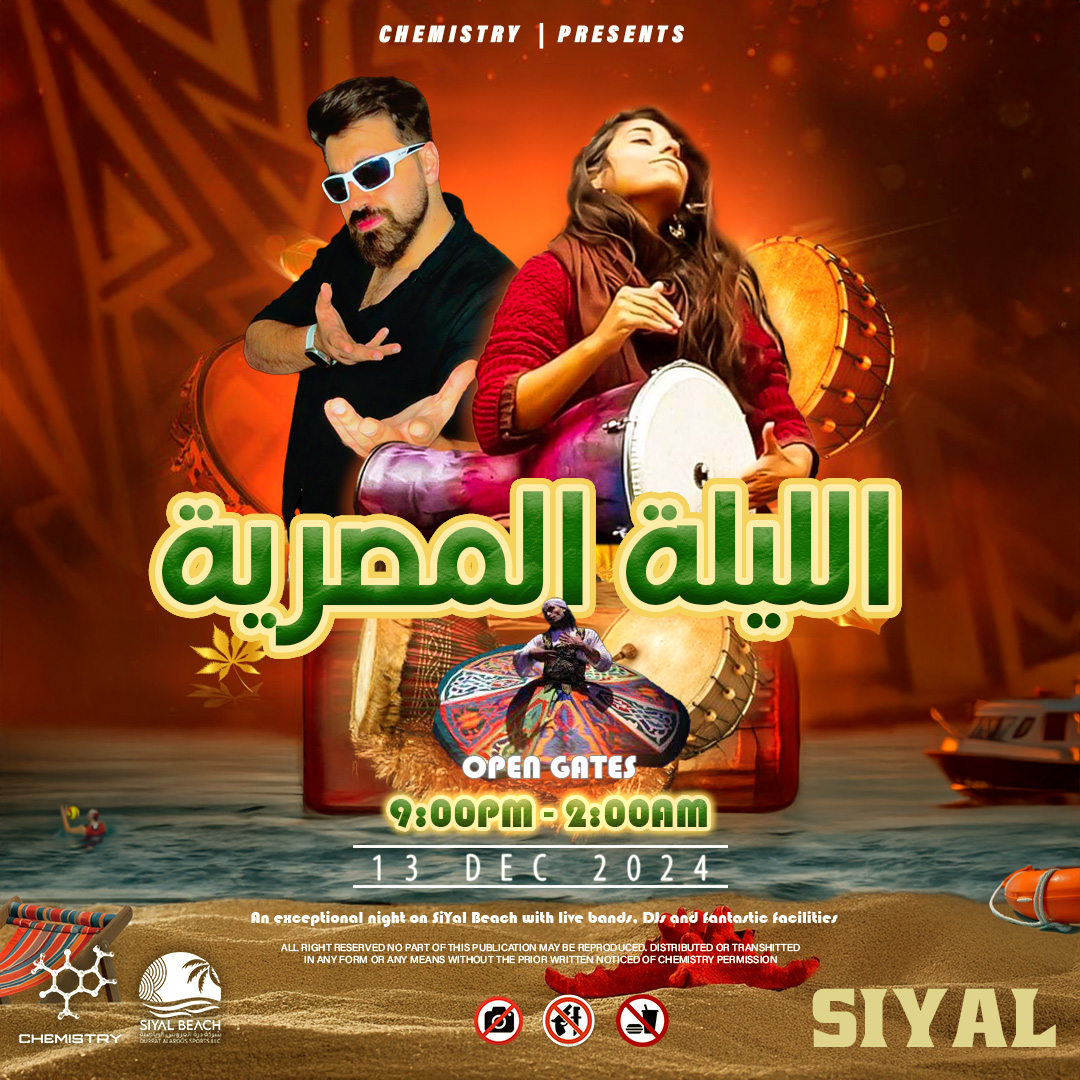 ندعوك لليلة مصرية في منتجع سيال، حيث الأجواء الأصيلة والموسيقى اللي بتاخذك لقلب مصر. من الطرب لحد المهرجانات، ولو عندك أغاني مفضلة، شاركنا بيها وهنضيفها للسهرة
